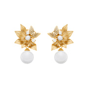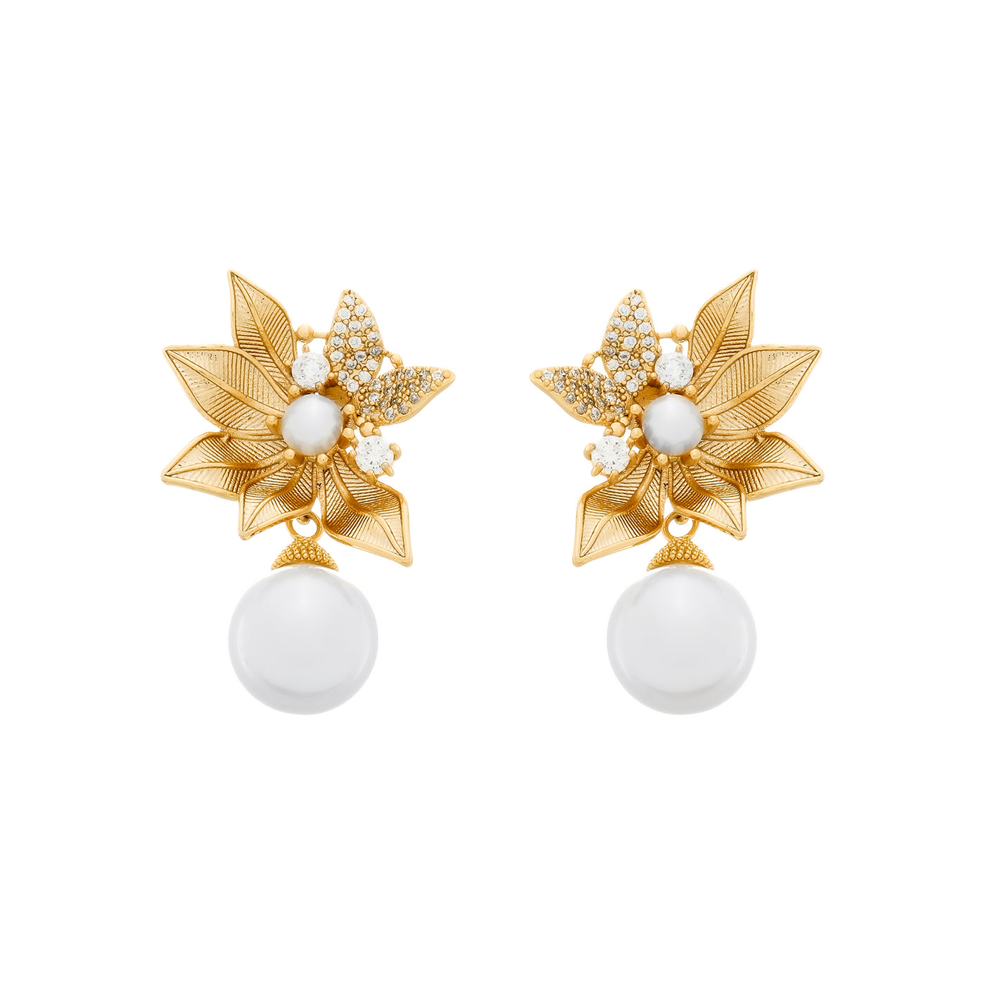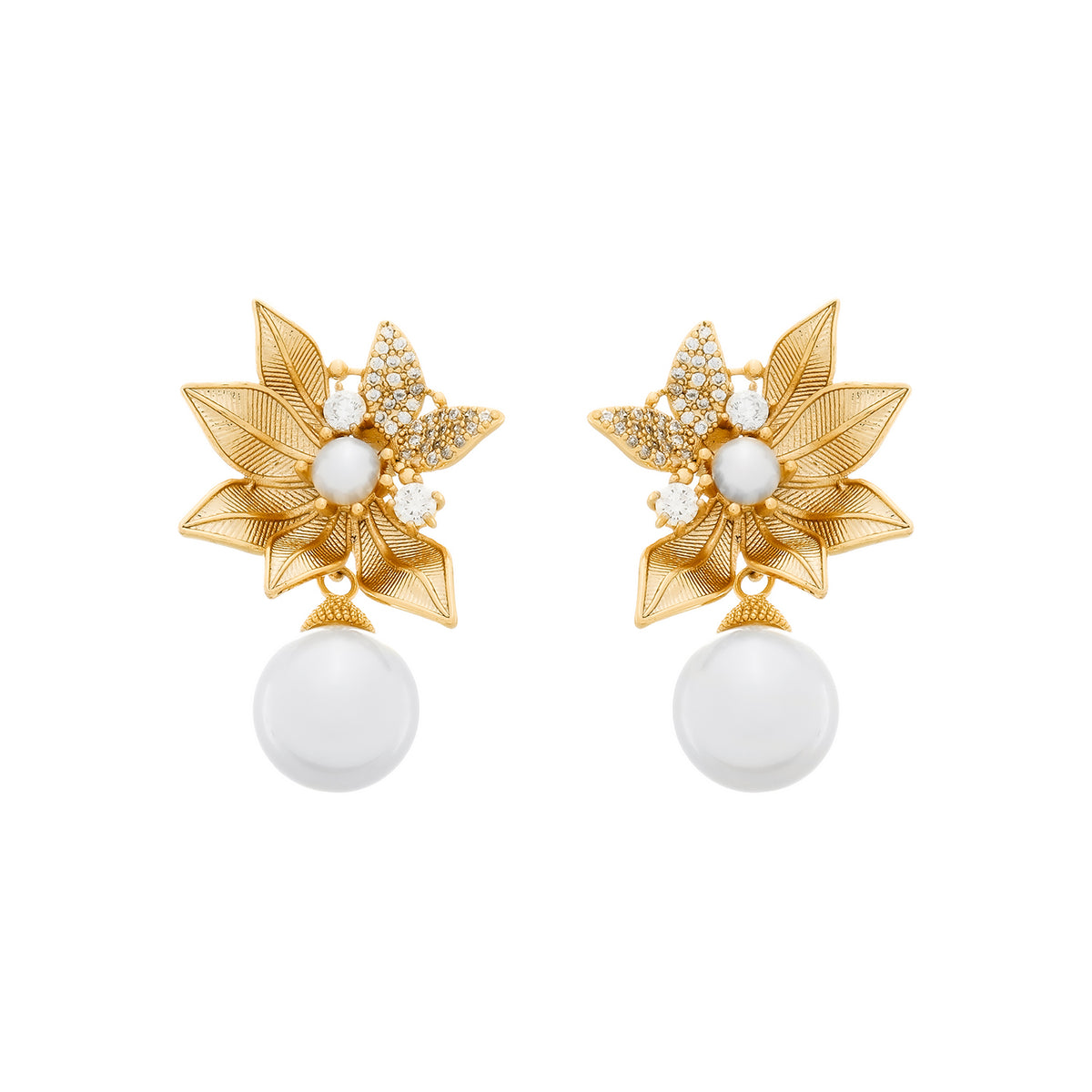 Brinco Dourado com Folhas em Zircônia e Pérolas